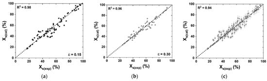 Correlation between the experimental softening fraction Xs(exp) and that predicted by the ANN Xs(cal): (a) ε = 0.15, (b) ε = 0.30 and (c) all the conditions.