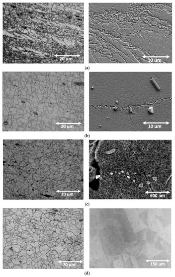 Metallographic analysis by OM and SEM of static softening in the conditions of (a) 1000 (X = 16%), (b)1050 (X = 69%), (c) 1100 (X = 75%) and (d) 1200 °C for tp = 800 s (X = 95%).