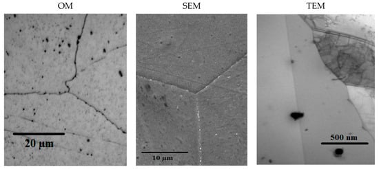 Figure 16 shows the microstructures of fine strain-induced Z-phase precipitates (CrNbN) (d < 200 nm) affecting the grain boundary mobility of the matrix in the condition of T = 1050 °C and tp = 800 s. The curve in the grain boundary graph indicates that precipitates exert an anchoring effect on the boundaries, inhibiting their mobility. Precipitation occurs more easily at high free energy sites, such as deformation bands and grain boundaries, since interfaces must be created in order to form a new phase within the matrix []. Thus, hot deformation induces the formation of fine precipitates, reducing the time required for its onset. This anchoring of precipitates at the grain boundaries hinders SRX grain nucleation, thus temporarily inhibiting its onset and development. However, coarse precipitates can impair mechanical properties, as has been reported in the literature [].