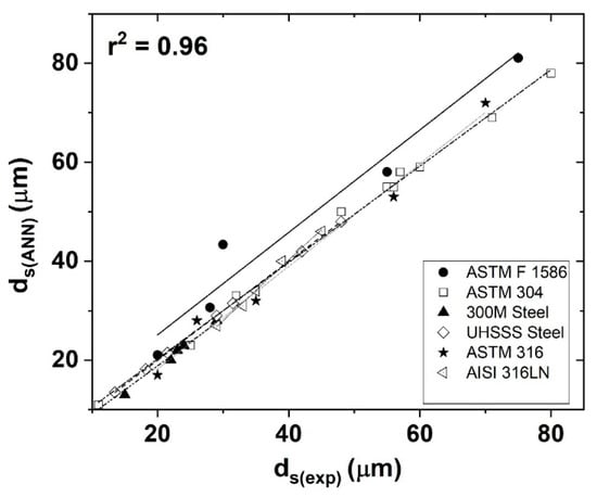 Figure 17 correlates the experimental recrystallized grain size (ds(exp)) and the one calculated via ANN (ds(ANN)), based on the constitutive model proposed by Tsurekawa, S. [] and shown in Equation (9). This constitutive relationship (Equation (9)) with a correlation coefficient of R2 = 0.96 indicates that this model is reliable for estimating the average grain size, in order to make forecasts for conditions within this hot working temperature range. The model allows one to associate the variables of stress (σ), softening fraction (Xs) and recrystallized grain size (ds), according to the deformation conditions, to control the kinetics of grain nucleation and growth. This is essential in thermomechanical processing with grain refinement optimization, aimed at increasing the nucleation rate and reducing the growth rate in order to improve the strength and toughness of finished products, with a notable effect on microstructural evolution.