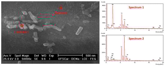 SEM/EDX images of fine Z phase precipitates (51.66% Nb, 23.97% Cr, 9.23% N) and of the austenitic matrix (61.32% Fe, 21.16% Cr, 9.88% Ni) in the condition of T = 1100 °C and tp = 10 s.