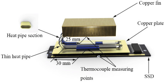 In other applications such as electronics, the heat generated by components of electronic circuits (such as transistors and SSDs) is enough to affect the performance and durability of the equipment. Therefore, for the general aim of electronic cooling, various technologies are used, including natural convection heat sink [17], forced convection radiator [18], heat pipe (HP) cooling [19], liquid cooling [20], thermosyphon [21], and single-phase/two-phase cold plate cooling [22]. Among the above technologies, the heat pipe heat sink is widely used due to its simple structure and high heat exchange efficiency [23]. Therefore, considering the structure of the SSDs, thin heat pipes with high heat transfer coefficients are more suitable for the cooling of SSDs.