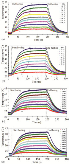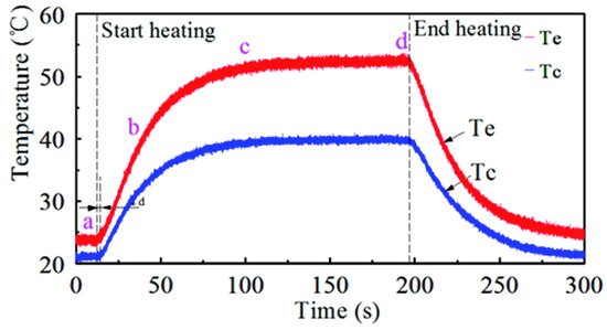 Figure 5 shows the temperature variation curve outside the evaporator and the condenser section of the SSD heat sink under the condition of 50 W of heat input. A single THP with a placement position of 0° is applied. The process includes three stages: linear temperature rises (ab segment), nonlinear temperature rises (bc segment), and the stable stage (cd segment). The initial temperature outside the evaporator rises linearly mainly due to the heat conduction of the copper matrix. Due to the fact that the heating coil is covered by thermal insulation material, the heat convection with the surroundings and the radiation were ignored here. After point b, due to the phase change in the THP and the convection heat transfer between the fins and the air, the SSD sink possesses a more prominent thermal enhancement; therefore, the temperature rise rate is lowered, and thus a nonlinear temperature rise appears. After point c, the temperature outside the evaporator and the condenser is stable, and the temperature difference between Tc and Te is stable too. When the heat source is turned off, both temperatures decrease gradually until they reach the ambient temperature.