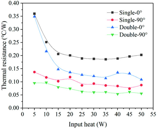 (2) The thermal resistance decreases with the increase in input heat, which may be caused by more violent convection and phase change heat transfer. As the input heat ranges from 0 to 15 W, the thermal resistance reduction trend of the heat sink placed at 0° is more evident, which decreases by about 42.7% and 57.5% for the heat sink with single and double THPs, respectively.