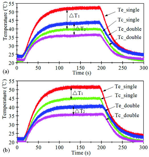 As shown in Figure 8, under the input heat of 50 W, the comparison between single THP and double THPs were discussed. When the heat sinks were placed at 0°, the temperature difference between the evaporator and condenser section for both heat sinks with single THP and double THPs are displayed in Figure 8a. Where Te and Tc refer to the temperature on the evaporator and condenser, the temperature values of Te and Tc are determined by the steady state temperature of the evaporator and the condenser of the heat sink. The temperature difference for the heat sink with double THPs is about 4.69 °C lower than that with single THP, corresponding to a lower thermal resistance by about 46.4%. Figure 8b shows the results with the heat sinks placed at 90°. The temperature difference for the heat sink with double THPs is about 1.61 °C lower than that with single THP, corresponding to a lower thermal resistance by about 36.7%. Therefore, double THPs exhibit a better heat transfer performance.