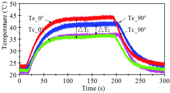 Figure 9 shows the temperature curves for different placement angles. Double THPs were applied with an input heat of 50 W. Similar variations of the temperatures are found, reflecting the same heat transfer mechanism. For the position angle at 0°, the temperature difference ΔT1 is much bigger than that with a position angle at 90° (ΔT2), corresponding to an increase in thermal resistance by about 48.9%. This result should be attributed to the higher flow resistance caused by the combination of gravity and the abrupt change of the flow direction as the THP was positioned at an angle of 0°. In this case, it is difficult to transfer the vapor to the condenser as the flow direction changes by 180° at the corner between the evaporator and the condenser. Moreover, it should also be noted that the delay time for the temperature rise of Tc is longer for the THPs at a placement angle of 0°, which also verified the higher flow resistance at the placement angle of 0°.