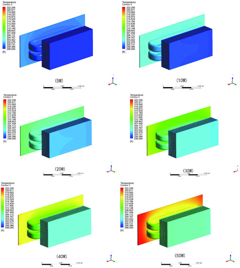 The final temperature contours of the double THPs heat sink with different input powers are shown in Figure 11. Figure 11 shows the temperature distribution cloud diagram of the double THPs heat sink under the steady state of numerical simulation. The heat pipe is placed at 90°. It can be clearly seen that heat is conducted to the evaporator section through the bottom of the heating plate. The heat is then transferred to the condenser section, resulting in a local temperature rise. After a period of time, the temperature on the heat sink and the ambient temperature reaches a stable state.