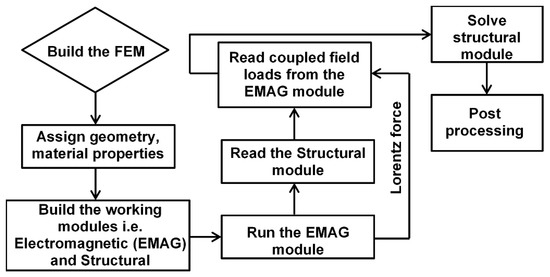 where is the current density in the electromagnetic coil (A/m2) and is the magnetic flux density (T). The electromagnetic module outputs Lorentz force, an input for the structural module. The current passing through the coil is the body load for the electromagnetic module.