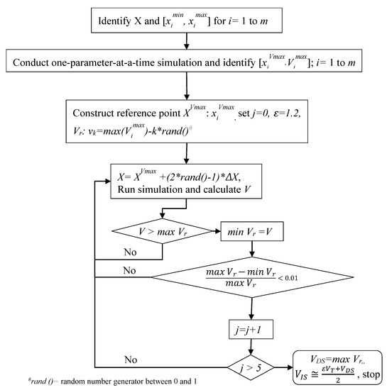 Let V be the impact velocity influenced by m number of process parameters (X: xi; i = 1 to m), each operating in a range of [ximin, ximax]. The maximum achievable impact velocity by altering xi, while keeping others at mid-range is Vimax (i.e., V = Vimax; when xi = xiVmax). Let Vr: vk be a set of five maximum possible impact velocities in the neighborhood (within 1% difference) that can be reached without damage and obtained through simulation. Once the maximum achievable impact velocity without damage (VDS) is obtained, VIS (effective impact velocity) is calculated using Equation (13). The algorithm for calculating the effective impact velocity is shown in the flowchart in Figure 4. The process parameters corresponding to the effective impact velocity obtained by selective grid inverse modeling vis-à-vis the FEM are run several times by changing process parameters, such that every time the simulated impact velocity nears the effective impact velocity parameter, the matrix is updated. The process converges when no significant change in impact velocity is observed for a certain number of FEM runs.