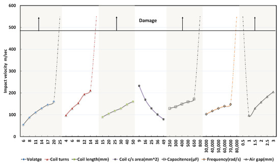 The outcome of the process parameter selection exercise is shown in Figure 5. The one-parameter-at-a-time investigation indicates that for a candidate pair of a given geometry, higher voltage values, coil turns, coil cross-section area, capacitance and frequency, and a very narrow air gap can damage the flyer tube because of undesirably high impact velocity. The maximum achievable impact velocity without damage (VDs) and the simulated effective impact velocity (VIS) obtained using the algorithm shown in Figure 4 were 484 m/s and 338 m/s, respectively. The values of process parameters obtained from the inverse modeling (voltage = 16 kV, air gap = 1.5 mm, coil turns = 6, coil length = 27 mm, coil cross-section area = 9 mm2 (circular) and frequency = 50,000 rad/s) yielded a simulated impact velocity of 341 m/s, which is close to the calculated value. The welding sample was manufactured with the obtained process parameters and checked for different experimental attributes, as presented below.