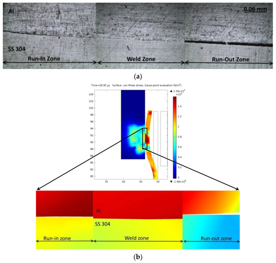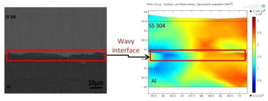 The pulse-welded Al-SS304 metal pair showed a wavy pattern at the impact zone, typical of MPW (Figure 6). The FEM also predicted a similar wavy morphology.