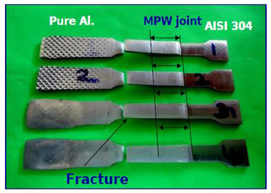 Figure 8 shows the joints after the lap-shear test. For all specimens, fracture occurred outside the welded region and at weaker Al, proving that the weld was sound. This result validates the proposed approach, wherein process parameters obtained with numerical modeling passed the mechanical test.