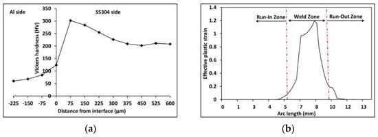 An agreement between experimentally observed hardness mapping and numerically obtained plastic strain also justified the proposed approach. The interface layer showed increased hardness relative to the base material (BM) (Figure 9a). The transition zone had the highest hardness value of 302 HV, much higher than the average BM hardness values of 55 HV for Al and 210 HV for SS304. The micro-hardness promptly increased on both sides of the transition zone and tended to be constant beyond these regions. This behavior was attributable to severe plastic deformation at the interface, observed in the simulated strain distribution in Figure 9b. Higher stress and strain were generated in the bonded center zone compared to the unbonded run-in and run-out zones.