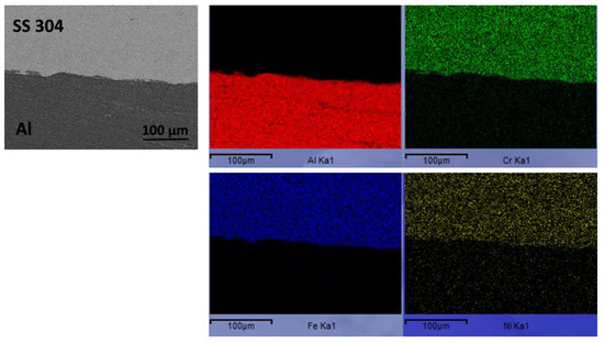 The transfer of material between the flyer and target materials resulted in several phenomena. One of the reasons for the increase in hardness (Figure 9a) in the interface layer or transition zone is the material transfer between the mating members due to the high-speed impact. The intermetallic phase formation at the welding interface cannot be avoided during MPW, particularly in the case of dissimilar material joining. Raoelison et al. [47,48] investigated the effect of process conditions on the interface properties and weld features for Al/Al and Al/Cu MPW joints. They found that an Al/Cu pair led to the formation of an intermetallic phase, whereas an Al/Al pair had metal continuity at the bonded interface. The interface wave results were due to flow velocity discontinuities [49]. The discontinuities caused waves across the interface. The two fluids with different velocities resulted in instabilities at the interface, which led to mass flow from one material to the other. Thus, element diffusion is inevitable during MPW of dissimilar materials, as shown in the surface EDS map in Figure 10. The intermetallic zone formation could be a direct result of the atomic diffusion of one metal in the other.