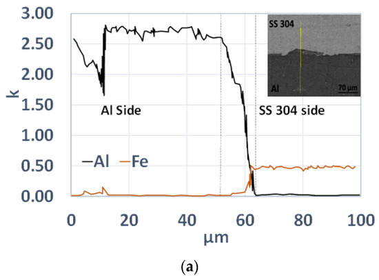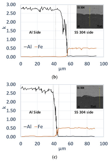 Line EDS is used to determine the distribution of Al and SS304 across the weld interface for the bonded center zone. Line analysis was performed across the intermediate layer (IML) at the crest of a wave, the trough of a wave, and a flat interface, as shown in Figure 11a–c, respectively. The area between the dotted lines corresponds to the IML region. The composition of elements (primarily aluminum) changed sharply in the IML region. Beyond this region, the composition of elements was almost constant. The width of the IML changed along the length of the bonded zone. Figure 11a shows the distribution of elements in the line scan performed along the crest of a wave. The width of the IML, in this case, was approximately 9 μm. The IML zone width increased slightly, by around 12 μm, at the trough of the wavy interface (Figure 11b). The distribution of Al changed gradually by several micrometers and then sharply decreased to zero. Along the flat interface (Figure 11c), there was a considerable decrease in the width of the IML (by around 5 μm).
