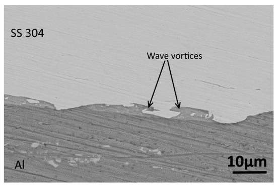 The chances of intermetallic phase formation increased with the increase in discharge energies. The maximum thickness of the intermetallic phase can increase to more than 25 µm at higher energies, which is detrimental to the weld quality and strength [50]. However, the maximum thickness observed with the parameters obtained from numerical modeling was around 10–12 μm, meaning the interface was free of any detrimental effects that indicate the proposed approach’s efficacy. The joint’s strength is also a result of interlocking between the two metal surfaces, as shown in Figure 12. A high-speed collision leads to the formation of a discontinuous interface that is mostly wavy, where the vortices of waves take part in mechanical interlocking as a joining mechanism. The interlocking is promoted by Al’s low strength and high ductility compared to SS304. This is like the combing action in dissimilar friction stir welding, where the low-strength alloy can penetrate the high-strength alloy and create mechanical interlocking. However, it is to be noted that the notion of interlocking due to the swirling kinematic flow in MPW may also be a defect site based on the nature of the swirl-affected zone. This is more evident in the case of MPW of dissimilar materials, where an intense swirling motion along the bi-metallic interface can lead to the formation of the intermediate phase, severely degrading the weld properties [47,48]. Thus, it is essential to have a proper set of input parameters that satisfy the weldability criterion and allow a significant reduction in the thickness of the intermediate phase.