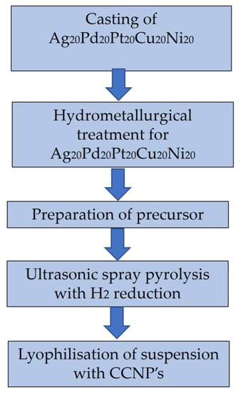 Based on our knowledge, references [4,20,21], and potential recycling, we tried to synthesise CCNPs from the cast alloy with an identical chemical composition using the USP. A hydrometallurgical approach was used to prepare the precursor by dissolving the initial cast Ag20Pd20Pt20Cu20Ni2 alloy with various acids. Synthesised CCNPs by USP are collected in suspension, and in order to obtain the CCNP powder it was necessary to remove the suspension by drying process. Freeze-drying is offered as one of the options (as lyophilisation), wherein it is possible to obtain nanoparticles in powder form, and thus achieve their use for further applications [22,23,24]. The mechanism for the formation of CCNPs was established at the end of the research.
