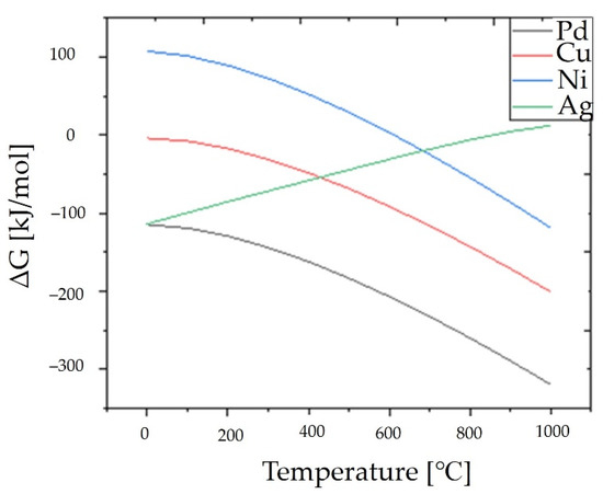 Using the HSC software package 6.12 (Outotec, Espoo, Finland), Figure 2 shows the thermochemical analysis of the hydrogen reduction in metals (Ag, Pd, Cu, and Ni), which in all cases have a negative Gibbs energy value at 700 °C. From Figure 2, it is also possible to see the high probability of the formation of metal nanoparticles under these conditions. The results of the thermochemical analysis of Pt are not shown, because the existing data were not found in the HSC program. Additionally, taking into account the fact that bimetallic Ni-Pt nanoparticles can be used for H2 storage [24], it can be assumed that Ni and Pt will not react to the same extent as other elements with H2.
