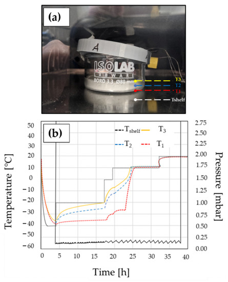 (a) Drying sample on a lyophiliser shelf with thermocouples (Tshelf—shelf temperature, T1—temperature of the bottom of the sample, T2—temperature of the middle of the sample, and T3—temperature of the top of the sample); (b) Lyophilisation drying protocol (shelf temperatures and vacuum level) with monitored temperatures.