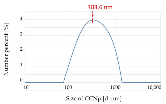 The hydrodynamic diameter of the CCNPs ranged from approximately 80 nm to 1300 nm, with an average value of 303.6 ± 28.04 nm and with a size polydispersity index of 0.261, as shown in Figure 5.
