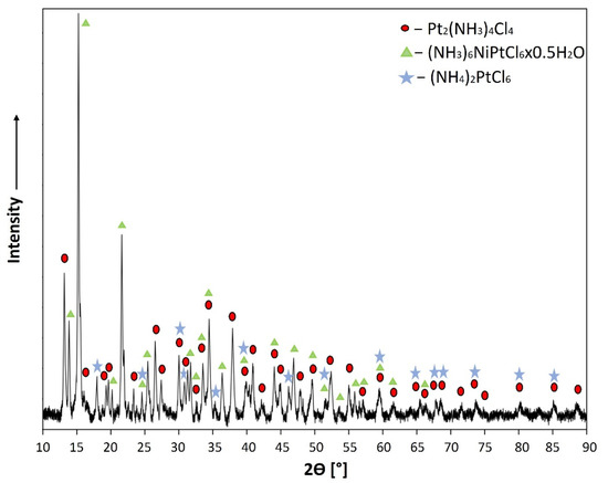 The recorded XRD spectrum of the precipitate has more than 50 peaks in the range 2Θ between 10° and 90° (Figure 6). Based on this, only the main peaks were considered, so the presence of the three most prominent salts ((NH4)2PtCl6, (NH3)6NiPtCl6 × 0.5H2O, Pt2(NH3)4Cl4) was revealed. All the salts are illustrated with characteristic peaks that have been compared with the literature data on structural factors [36]—see the supplementary file.