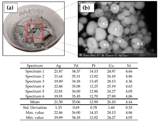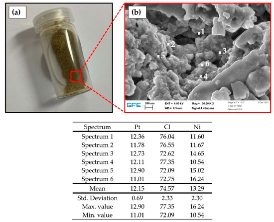 The incomplete dissolution and the formation of the precipitates were observed during the dissolution and preparation of the precursor. Figure 7a shows the filtered and dried insoluble precipitate, while Figure 7b shows a micro-view of the resulting precipitate. In order to determine the chemical composition of this precipitate, an EDS micro-analysis was performed. The six characteristic places of the point analysis are shown in Figure 7b, while the EDS results are shown in the lower part of Figure 7 as a table. The precipitate was rich in Pt, Ni, and Cl.