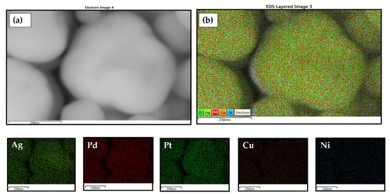 The EDS analyses show the presence of all five elements in the CCNPs. The achieved chemical composition from EDS for CCNPs was approximately Ag22Pd35Pt13Cu26Ni4 (in at. %). According to our calculated value for the configuration entropy of mixing, the CCNPs formed in this way belong to the group of medium entropy materials. Elemental mapping was conducted additionally, which showed the distribution of the elements on the CCNPs’ surfaces. All five elements were distributed uniformly in the nanoparticles—as presented in Figure 9—suggesting that CCNPs were mixed atomically without phase separation.