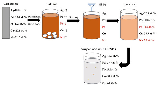 The formation of CCNPs of different chemical compositions from the initial cast alloy can be attributed to a complex, incomplete dissolution. A schematic representation of the hydrometallurgical treatment of the cast alloy is shown in Figure 11, with a focus on changing the chemical composition by individual element.