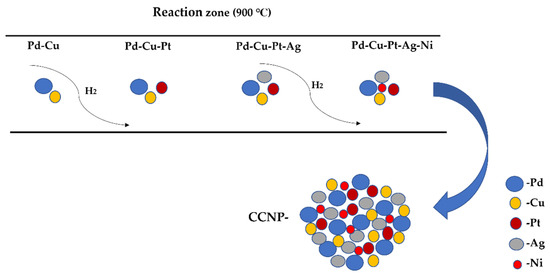 As the dissolution of the cast alloy itself is complex, and, thus, the dissolution of the formed precursor, the enthalpies of mixing of individual binary systems were used to establish the mechanism of the formation of CCNPs. By comparing the values of the enthalpy of the mixing of the binary systems, as well as the thermochemical analysis of the reduction, it can be assumed that the first homogeneous formation was due to the entire volume of Pd and Cu, consequently possessing a high negative value of mixing enthalpy with almost all elements. Platinum has a slightly lower negative enthalpy of mixing with almost all elements, and can be assumed to form immediately after Pd and Cu. Since Ag has a slightly lower enthalpy of mixing with all elements other than Ni, it can be assumed that Ag is formed after Pt, and then Ni. All the elements were homogeneously distributed throughout the CCNPs’ volume. The formed non-ideal spherical shape of the CCNPs was a consequence of the coagulation of droplets during their transportation to the furnace. Based on the analysed results and literary knowledge, a mechanism for CCNPs’ formation was proposed, which is shown in Figure 12.