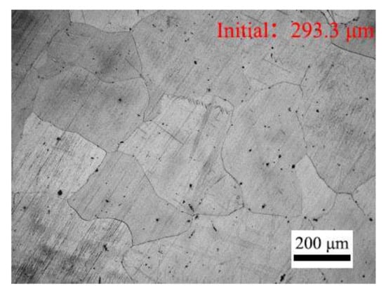 The initial material in this work was the as-cast AZ31 magnesium alloy plates with 30 mm thickness. Their nominal composition was determined as Mg, 3 wt.%; Al, 1 wt.%; Zn, 0.2 wt.%; and Mn by an inductively coupled plasma analyzer (ICP, Thermo Corp., Waltham, MA, USA). These initial materials were homogenized at 400 °C for 24 h in an electric furnace to improve component segregation and eliminate possible intercrystalline phases according to the literature []. Moreover, in order to improve their workability, all sheets were preheated to 400 °C for 30 min prior to hot rolling. In this work, all thickness reductions were set to 20% at break-down rolling pass in order to avoid premature cracking and then increased to 30% to improve the degree of DRX. According to previous studies, a lower deformation temperature easily realizes grain refinement. Therefore, in order to refine the grain size effectively, the rolling temperature tended to decrease as the rolling proceeded, i.e., 400 °C (Pass 1), 380 °C (Pass 2), 360 °C (Pass 3), 340 °C (Pass 4), 320 °C (Pass 5), 300 °C (Pass 6), 280 °C (Pass 7), and 260 °C (Pass 8). The detailed rolling process parameters are summarized in Table 1.