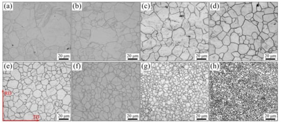Microstructure characteristics of AZ31 magnesium alloy sheets during multi-pass lowered-temperature rolling: (a) Pass 1; (b) Pass 2; (c) Pass 3; (d) Pass 4; (e) Pass 5; (f) Pass 6; (g) Pass 7; (h) Pass 8. (RD: rolling direction, TD: transverse direction).