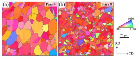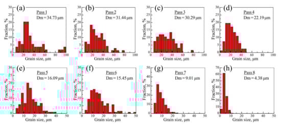 Further decreasing the rolling deformation increased the degree of DRX, producing a large number of fine, equiaxed grains in the Pass 3 sheet and Pass 4 sheet (Figure 2). Figure 3 shows that their average grain sizes were refined to 30.29 μm in the Pass 3 sheet and 22.19 μm in the Pass 4 sheet. However, from their grain size distributions, 7.27–75.7 μm in the Pass 3 sheet and 3.53–46.21 μm in the Pass 4 sheet, it could be concluded that their microstructure homogeneity was not good enough []. Moreover, their coarse grains were highly distorted, suggesting that the new DRX embryo was developing at the grain boundaries []. This further demonstrated their mixed microstructure with large and fine grains. After Passes 5 and 6, the abnormally coarse grain had nearly disappeared and the fractions of DRX grain obviously increased (Figure 2e,f). The microstructure homogeneity was distinctly improved compared to the prior microstructure homogeneity, which could be supported by the unimodal grain size distributions (Figure 3e,f). After Pass 7, the microstructure presented a typical DRX microstructure appearance with excellent microstructure homogeneity. The resulting sheet after Pass 8 had the smallest average grain size of 4.38 μm (Figure 3h). The above metallographic results suggested that, based on the principle of multiple DRX, multi-pass lowered-temperature rolling was not only beneficial to refine the grain size but also to improve the microstructure homogeneity. In addition, in order to obtain a better magnesium alloy microstructure in the future, mathematical modeling between the rolling parameters and the DRX grain size should be established based on the Zener–Hollomon law, similar to the mathematical modeling established in the literature [].