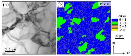 In order to further characterize the DRX behavior during the rolling, the TEM observation and the grain orientation spread (GOS) map was applied for the Pass 8 sheet, as shown in Figure 4. Clearly, Figure 4a shows that each grain interior was clean and uniform. This suggested that no crystal orientation difference occurred in one individual grain and thereby no obvious defects developed in such grains. Additionally, Figure 4b shows the DRX microstructure of the Pass 8 sheet using the GOS map in which the grains were outlined by the high-angle grain boundaries ranging from 15° to 180°, and the grains with the GOS values smaller than 2° were considered to be the DRX grains (blue and green color) according to the literature [,]. Obviously, there were only blue- and green-colored grains in the microstructure, again validating the complete DRX behavior in the Pass 8 sheet. These results together demonstrated that the dislocation density was lower due to the complete DRX behavior during the multi-pass lowered-temperature rolling.