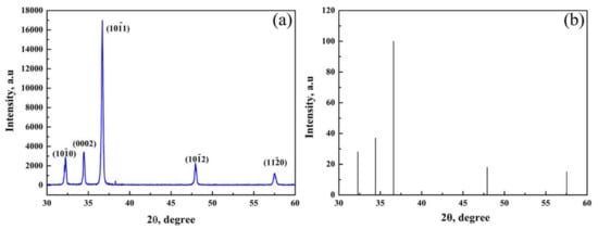 It is well known that the HCP structure in magnesium alloy is liable to cause a strong (0002) basal texture, strongly influencing the mechanical properties [,]. Therefore, it was necessary to investigate the texture evolution in multi-pass lowered-temperature rolling. According to the literature [], the texture state of magnesium alloy can be estimated by both XRD and EBSD. In this work, XRD was applied to measure the texture state of the initial material, and the ratios of the diffraction peaks, and , were calculated to quantify the texture characteristics. Figure 5a,b shows the XRD spectrum of the initial material and pure magnesium powder (PDF#35-0821), respectively. Clearly, the ratios of the initial material were similar to those of the standard magnesium card. This suggested that there was no preferred crystalline orientation in the initial material.
