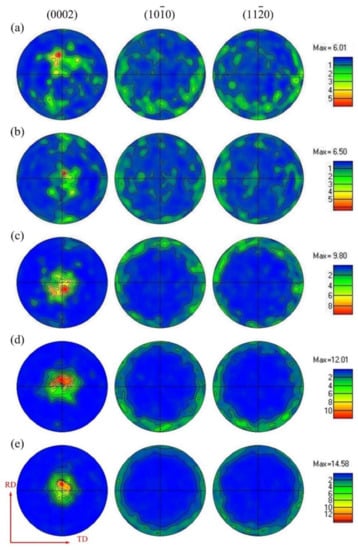 (0002), (10–10), and (11–20) pole figures of AZ31 magnesium alloy sheets during multi-pass lowered-temperature rolling: (a) Pass 1; (b) Pass 2; (c) Pass 4; (d) Pass 6; (e) Pass 8. (RD: rolling direction, TD: transverse direction).