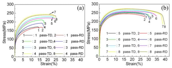 Room temperature stress–strain curves of AZ31 magnesium alloy sheets along the RD and TD during multi-pass lowered-temperature rolling: (a) from 1 pass to 4 pass and (b) from 5 pass to 8 pass.