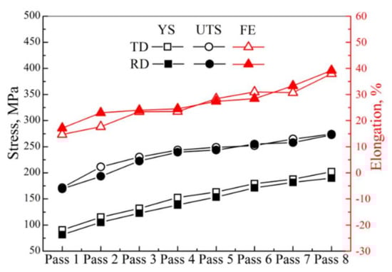 Stress (YS and UTS) and elongation (FE) variation of AZ31 magnesium alloy sheets along the RD and TD during multi-pass lowered-temperature rolling (YS: yield stress; UTS: ultimate tension stress; FE: fracture elongation).