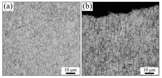 Metallographic observations of the uniform deformation part A (a) and necking part B (b) indicated by the black point in Figure 11a.