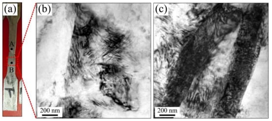 Another mechanism describing the higher fracture elongation of the resulting sheets is the activation of non-basal slips (pyramidal slip or prismatic slip). The activation of non-basal slips would delay the texture strengthening and then release the stress concentration. Koike et al. pointed out that non-basal slips could be activated when the grain size was less than 10 μm, and under this case, the cross-slip of <a> dislocation from the basal to the prismatic plane occurred readily []. Similarly, Zhao et al. and Mayama et al. found that the profuse prismatic <a> dislocation activations would suppress twinning formation by rotating grains to preferred orientations for further deformation, resulting in improved ductility [,]. In our recent work, a considerable proportion of prismatic <a> dislocations was activated during the tension deformation of AZ31 magnesium alloys, which was closely related to their higher tensile elongation []. The resulting sheet possessed a finer grain size less than 10 μm, which was conducive the activation of non-basal slips. The evidence could be obtained by the TEM characteristics of the necking part of the tension sample (Figure 11). Figure 11a,b depicts abundant dislocation pile-up and twins, respectively. In such a complex dislocation tangle, non-basal dislocations are bound to participate. Therefore, the activation of the non-basal slip produced by a finer grain size partly contributed to the higher fracture elongation.