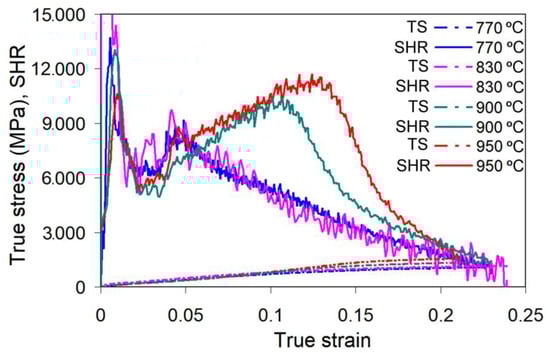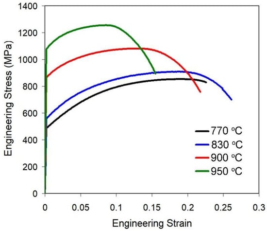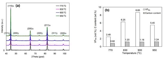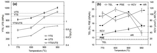 - With an increase in the austenitization temperature, the volume fraction of proeutectoid ferrite decreased from 50 vol.% (at TA = 770 °C) to 0 vol.% (at TA = 950 °C), followed by a monotonous increase in UTS from 821 MPa to 1207 MPa. Total elongation changed along a curve with a maximum (25%) associated with austenitization at 830 °C. Furthermore, this temperature corresponded to the lowest impact toughness.