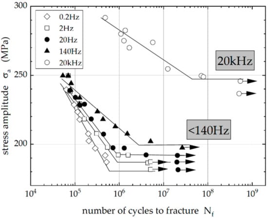 According to Jeddi and Palin-Luc [16], one can distinguish between (i) intrinsic effects, such as strain rate sensitivity of dislocation plasticity, adiabatic local heating and recrystallization, or dynamic strain ageing; and (ii) extrinsic effects, such as oxide-induced crack closure or atmospheric slip irreversibility. In addition, sample size effects have to be considered, i.e., the larger the stressed volume, the lower the fatigue strength. As an example, Figure 1 shows the pronounced frequency effect of plain 0.15% carbon steel [17].