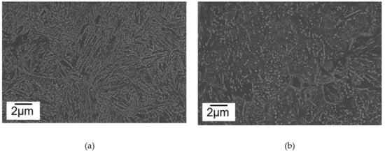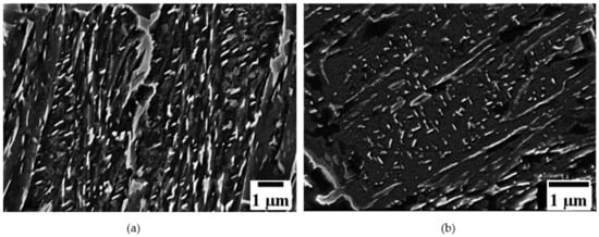 SEM micrographs of thermomechanically-processed steel 16 CrMnV7 7: (a) lower bainite with cementite platelets, and (b) self-tempered martensitic microstructure with homogeneously distributed small cementite precipitates.