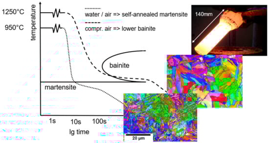 In the case of 16MnCrV7 7, cylindrical samples were forward hot-extruded at 1250 °C and 950 °C, respectively, within a 1000 kN screw press (Weingarten) and subsequently quenched according to defined conditions: (i) pressurized-air quenching to 260 °C followed by slow cooling within the furnace throughout the lower-bainite transformation regime (dashed line in the TTT diagram, Figure 3), and (ii) water-quenching below martensite start (Ms) followed by ambient air cooling (self-tempered martensite, dotted line in the TTT diagram, Figure 3). Due to the different forging temperatures, the prior austenite grain size and the non-equilibrium ferrite lath size are larger in the lower bainite structure as compared to the self-tempered martensite structure, as shown in the EBSD inserts in Figure 3.