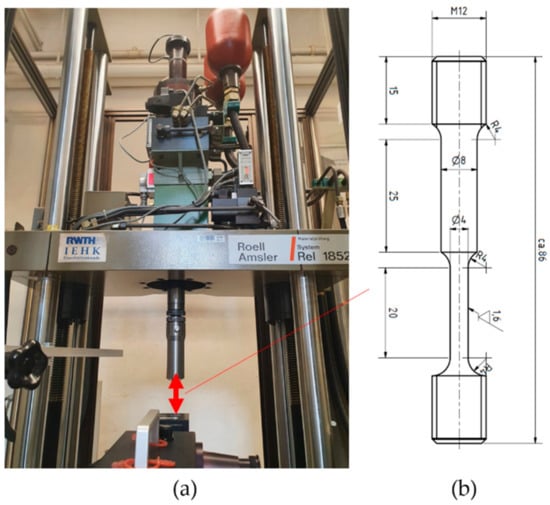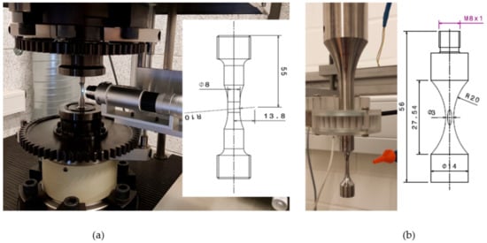 In addition to the quasi-static tensile tests, high strain rate tests were carried out using a 15 kN RoellAmsler servohydraulic high-rate testing system with a specimen geometry, as shown in Figure 6.