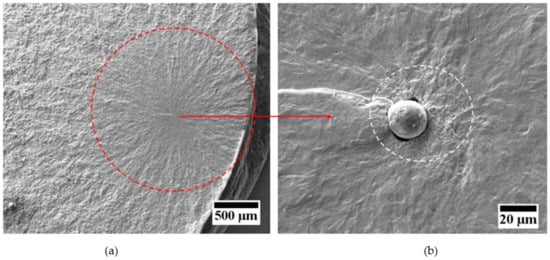 Fracture surface of the 50CrMo4—57HRC steel with a fisheye ((a), red circle) and crack initiation at a non-metallic inclusion (type Al2O3-CaO) surrounded by FGA ((b), white circle), tested at 95 Hz, σa = 480 MPa.