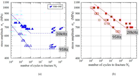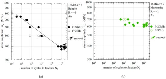 Wöhler S-N Diagram showing the fatigue life for the 16 MnCrV7 7 steel at two testing frequencies of f = 95 Hz and f = 20 kHz for (a) the bainitic, and (b) the self-tempered martensitic condition.