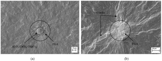 In the high-strength condition steel, 50CrMo4—57HRC, the fatigue damage behavior is completely different. Internal VHCF crack initiation at 10–20 µm-sized nonmetallic Al2O3∙CaO-type inclusions forming the center of the fisheye (red circle) prevails (Figure 8a). As outlined in the introduction, the crack initiation site is surrounded by a fine granular area (FGA), as shown in Figure 8b.