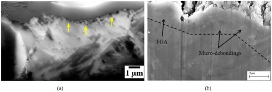 Figure 13 shows FIB sections through FGAs emanating from an inclusion and a microstructure inhomogeneity (probably a grain-boundary triple point). In particular, Figure 13a shows the rim of nanograins that form the FGA at an Al2O3-type inclusion.