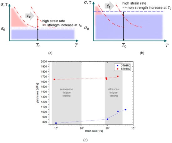 Figure 14a,b shows the two contributions. In the case of moderate strength (Figure 14a), τ0 is rather low and at high strain rates, the increase in τ* leads to an apparent increase in the yield stress. In the high-strength condition (Figure 14b), the high-strain rate effect vanishes due to the high τ0 contribution. This hypothesis (cf. [26]) is supported by dynamic tensile testing at strain rates between = 1 s−1 and = 500 s−1. The results (Figure 14c) show for the 50CrMo4—57HRC high-strength condition a negligible strain rate dependence, while for the 50CrMo4—37HRC moderate-strength condition, the strain rate dependence leads to an approximately 30% increase in yield stress.