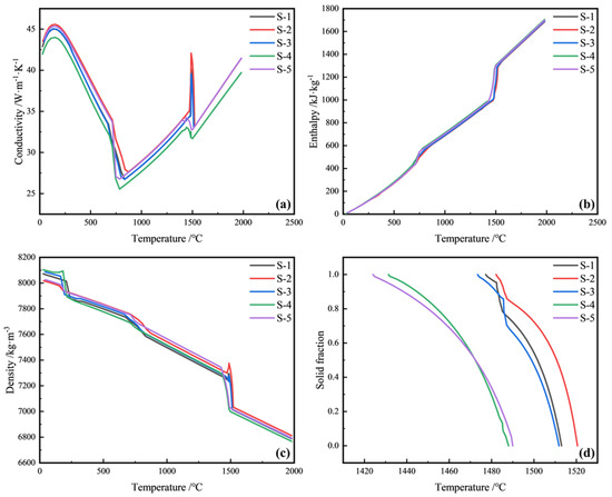 The thermal conductivity, density, enthalpy, and solid fraction can be obtained from the ProCAST software database according to the steel compositions. The thermal properties of different steels are shown in the Figure 2.